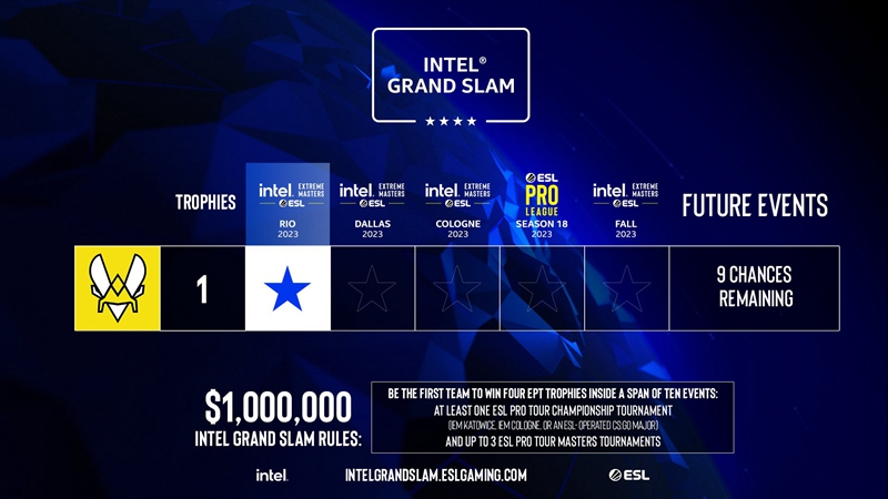 若要加冕本届大满贯,Vitality尚需3个EPT旗下赛事的冠军,且其中必须包含IEM卡托、IEM科隆或ESL举办的Major赛事中的一个。目前Vitality还有9次机会。