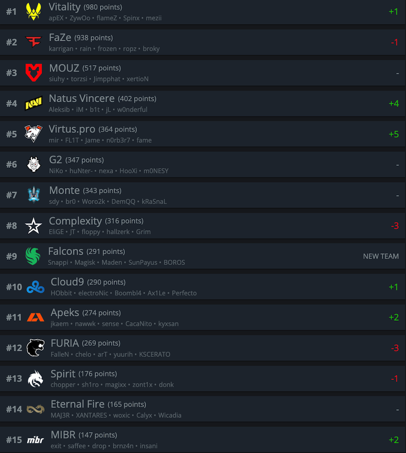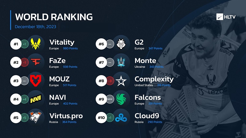 HLTV本周世界排名:Vitality升至第一 Falcons进入前十