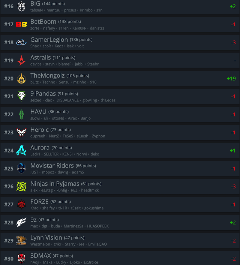 1-10名中变动不小,凭借在BLAST 秋季决赛和全球总决赛的二连冠,Vitality取代FaZe成为目前世界排名第一的战队。至于Natus Vincere和Virtus.pro也挺进到前五当中。Cloud9上升一名成为前十守门员。值得注意的是,阵容刚刚搭建好的Falcons由于继承了ENCE核心阵容的积分,目前排名世界第九。 11-20名中TheMongolz异军突起,排名上升19位列第20。 21-30名中变动幅度不大,TYLOO已经掉出Top30,而Lynn Vision目前位列29名。其他中国战队方面,Wings Up下降9名来到第84位,Newhappy目前排名上升1名至第92位,Steel Helmet排名相较上周上升7名来到第100位,Rare Atom下跌5名目前排在第153位。